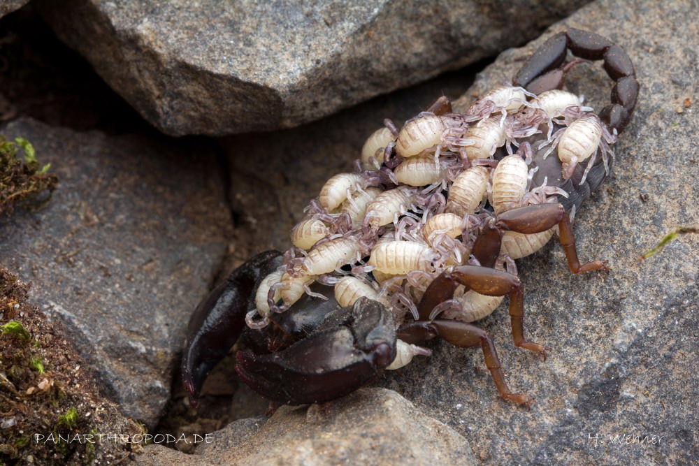 Afterwards they begin climbing onto the mother's back, were they will stay for the rest of the larval stage (Instar 1) in a passive manner (Fig. 4). The first instar takes between 5 days and over 2 weeks depending on species (Lourenço, 2000). The habitus of the young does not resemble that of the adults too much during this time, they are unable to feed and to sting (Lourenço, 2000). In this vulnerable phase they find protection from predators on the mother's back and and she regulates their loss of transpiratory water, since the young still lack the highly water-impermeable cuticula of scorpions of 2nd instar or higher - the mother shows strong protective behavior during this time (Polis, 1990, p200-201).
